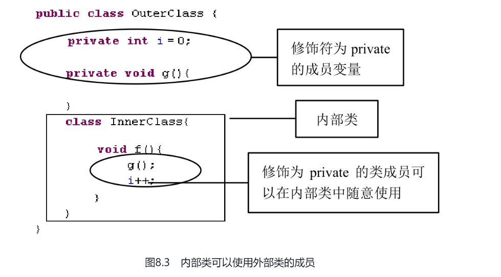 2.在一个类中使用内部类,可以再内部类中直接存取其所在类的私有成员变量,在成员内部类中可以随意使用外部类的成员方法及成员变量,尽管成员变量i以及成员方法g()都在外部类中被修饰为private,但在成员内部类中可以直接使用。成员内部类的语法如下: