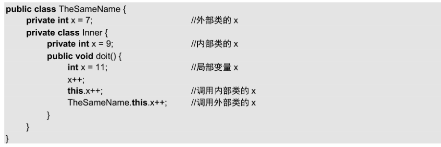 1.如果在外部类中定义的成员变量与内部类的成员变量名称相同,可以使用this关键字。