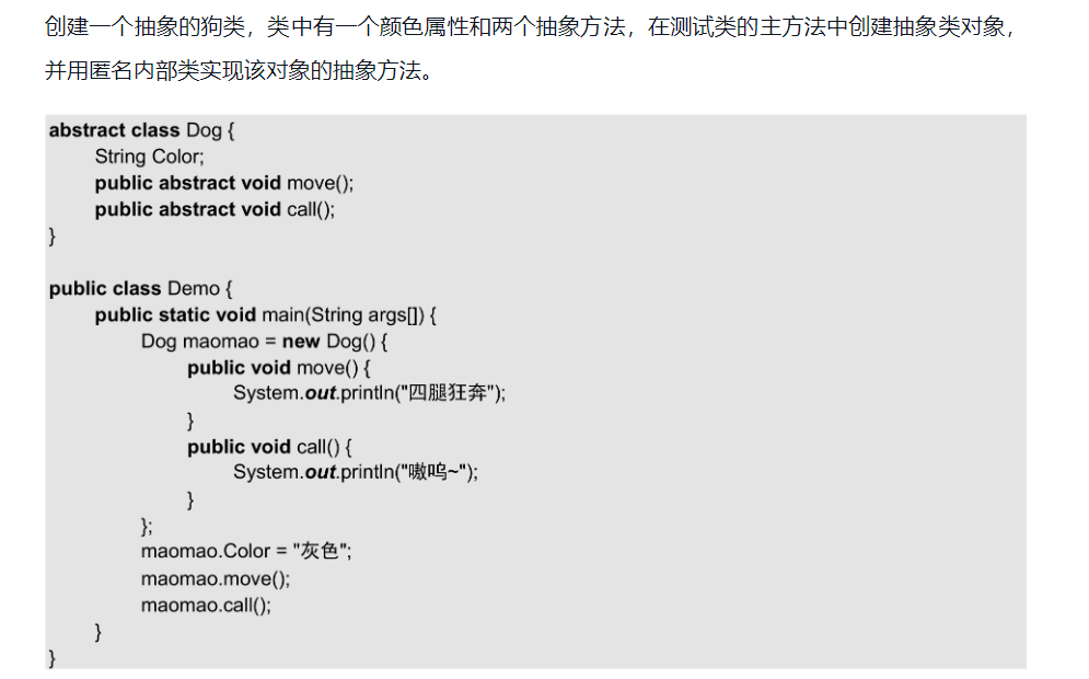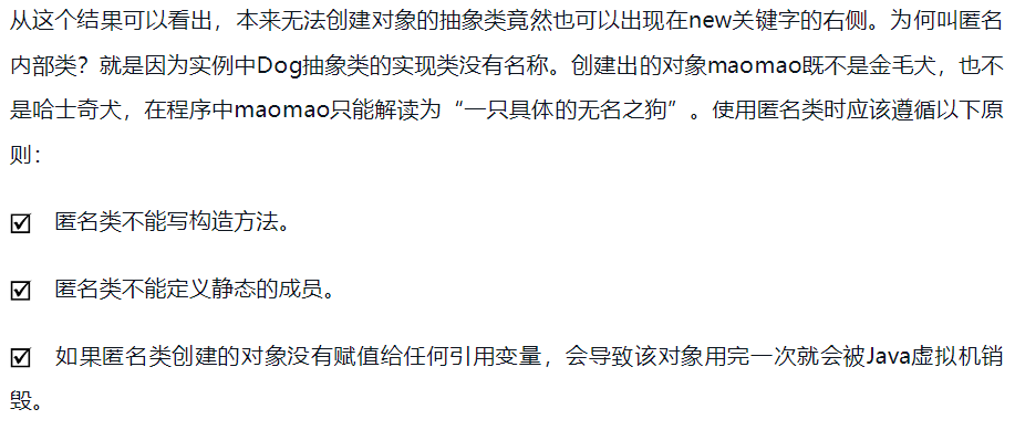 1.匿名类是只在创建对象时才会编写类体的一种写法。匿名类的特点是“现用现写”,其语法如下: