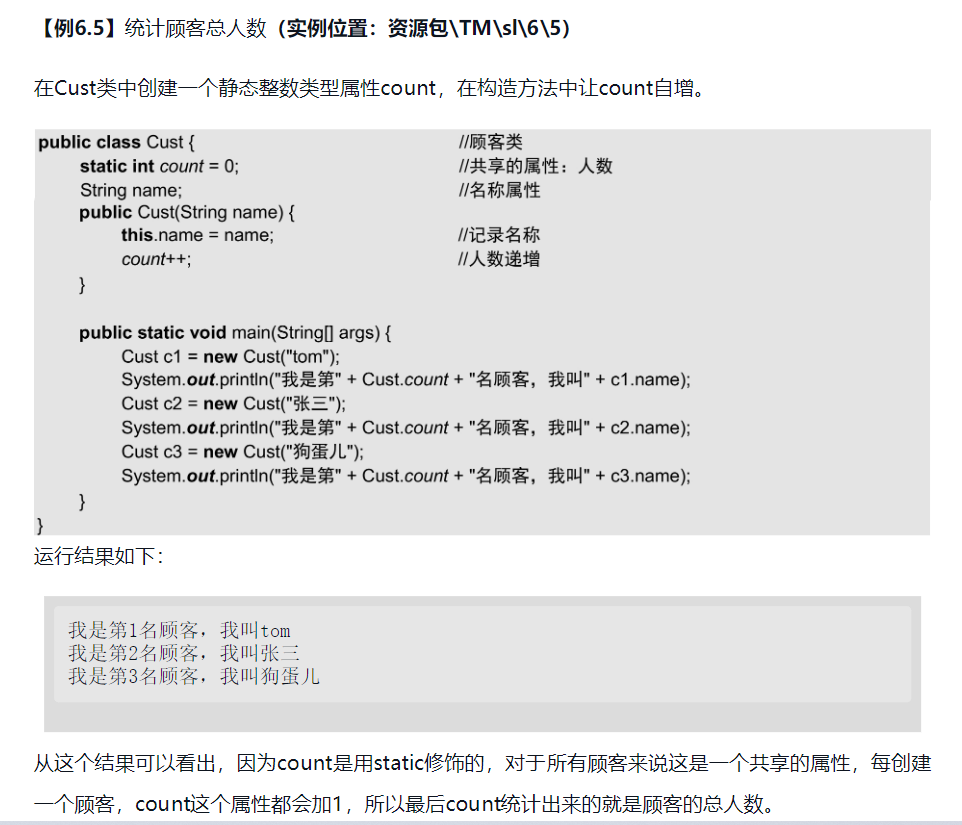 3.被声明为static的变量和方法被称为静态成员。静态成员属于类所有,区别于个别对象,可以在本类或其他类使用类名和“.”运算符调用静态成员:类名.静态成员