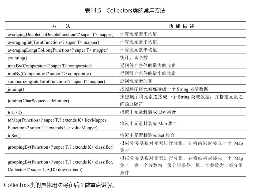 同时,Collectors类还提供了很多实用的数据加工方法,如数据统计计算等。Collectors类的常用方法如表14.5所示。