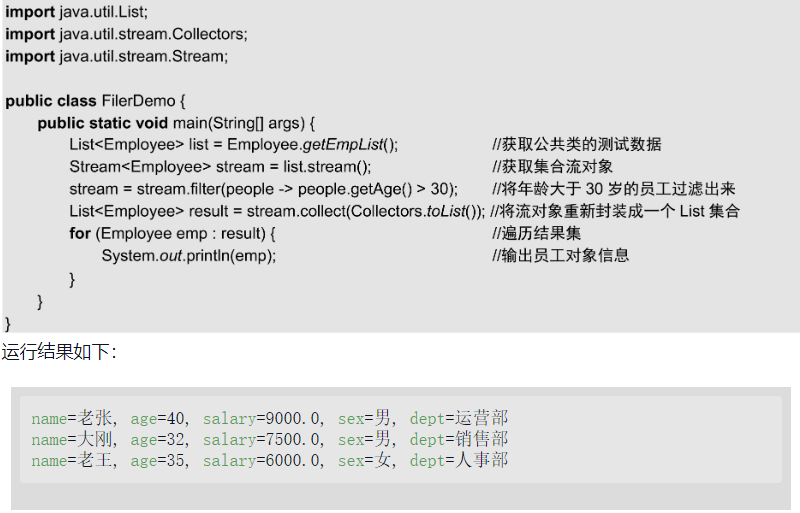 本实例使用了例14.14定义的Employee类,在获取员工集合后,将年龄大于30的员工过滤出来。如果将员工集合返回的流对象泛型定义为<Employee>,就可以直接在lambda表达式中使用Employee类的方法。