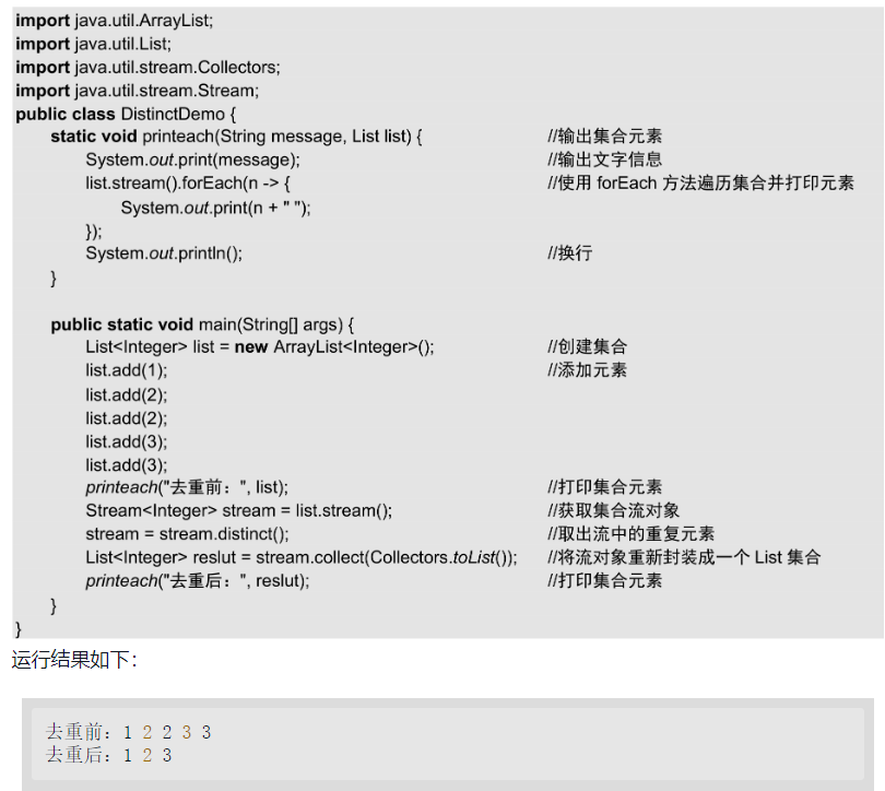 distinct()方法是Stream接口提供的过滤方法。该方法可以去除流中的重复元素,效果与SQL语句中的DISTINCT关键字一样。