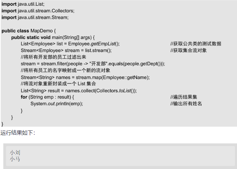 本实例使用了例14.14定义的Employee类,在获取员工集合后,先过滤出开发部的员工,再引用员工类的getName()方法作为map()方法的映射参数,这样就获取到开发部员工名单。