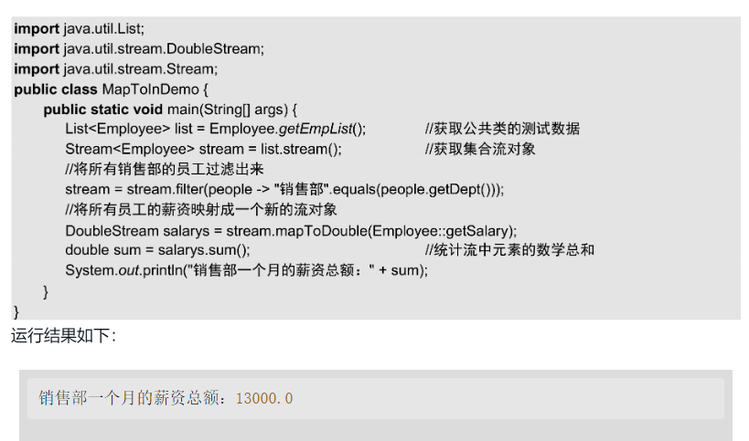 除了可以映射出员工名单,还可以对映射数据进行加工处理。例如,统计销售部一个月的薪资总额。因为涉及数字计算,所以需要让Stream对象转为可以进行数学运算的数字流。因为薪资类型是double类型,所以应该调用mapToDouble()方法进行转换。