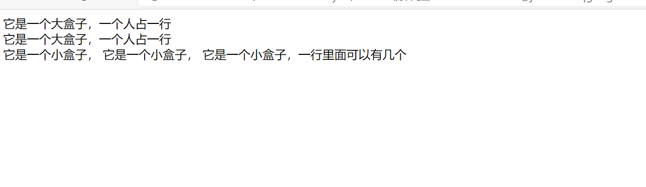<!DOCTYPE html> <html lang="en"> <head> <meta charset="UTF-8"> <title>Title</title> </head> <body> <div>它是一个大盒子,一个人占一行</div> <div>它是一个大盒子,一个人占一行</div> <span>它是一个小盒子,</span> <span>它是一个小盒子,</span> <span>它是一个小盒子,一行里面可以有几个</span> </body> </html>