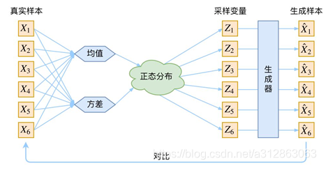 把一堆真实样本通过编码器网络变换成一个理想的数据分布,然后这个数据分布再传递给一个编码器网络,得到一堆生成样本,生成样本与真实样本足够接近的话,就训练出了一个自编码器模型。那VAE就是在自编码器模型上进一步变分处理,使得编码器的输出结果能对应到目标分布的均值和方差,如下图所示: