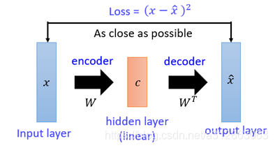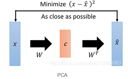回顾上述介绍,我们会发现PCA与我们想要构造的自编码器的相似之处是在于,如果把矩阵\(x\)视作输入图像,\(W\)视作一个编码器,低维矩阵\(c\)视作图像的编码,然后\(W^T\)和\(\hat{x}\)分别视作解码器和生成图像,PCA就变成了一个自编码器网络模型的雏形。