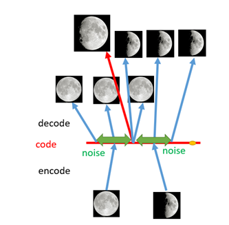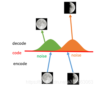 如上图所示,现在在给两张图片编码的时候加上一点噪音,使得每张图片的编码点出现在绿色箭头所示范围内,于是在训练模型的时候,绿色箭头范围内的点都有可能被采样到,这样解码器在训练时会把绿色范围内的点都尽可能还原成和原图相似的图片。然后我们可以关注之前那个失真点,它处于全月图和半月图编码的交界上,于是解码器希望它既要尽量相似于全月图,又要尽量相似于半月图,于是它的还原结果就是两种图的折中。