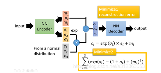在auto-encoder中,编码器是直接产生一个编码的,但是在VAE中,为了给编码添加合适的噪音,编码器会输出两个编码,一个是原有编码\((m_1,m_2,m_3)\),另外一个是控制噪音干扰程度的编码\((\sigma_1,\sigma_2,\sigma_3)\),第二个编码为随机噪音码\((e_1,e_2,e_3)\)分配权重,然后加上\(\exp(\sigma_i)\)的目的是为了保证这个分配的权重是个正值,最后将原编码与噪音编码相加,就得到了VAE在code层的输出结果\((c_1,c_2,c_3)\)。其他网络架构都与Deep Auto Encoder无异。