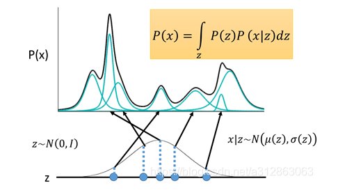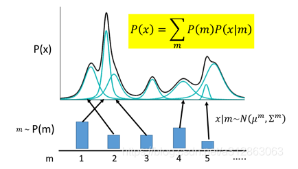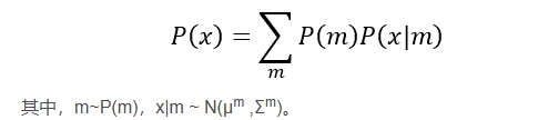 如上图所示,\(m\)代表着编码维度上的编号,譬如实现一个512维的编码,\(m\)的取值范围就是1,2,3,...,512。\(m\)会服从于一个概率分布\(P(m)\)(多项式)。现在编码的对应关系是,每采样一个\(m\),其对应到一个小的高斯分布\(N(\mu^m,\sum^m)\)。现在编码的对应关系是,每采样一个\(m\),其对应到一个小的高斯分布\(N(\mu^m,\sum^m)\),\(P(x)\)就可以等价为所有的这些高斯分布的叠加,即: