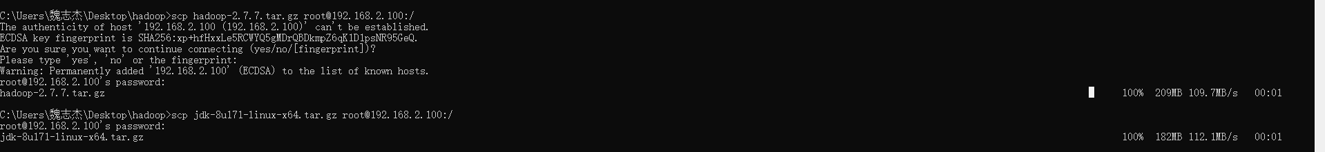 scp hadoop-2.7.7.tar.gz root@192.168.2.100:/