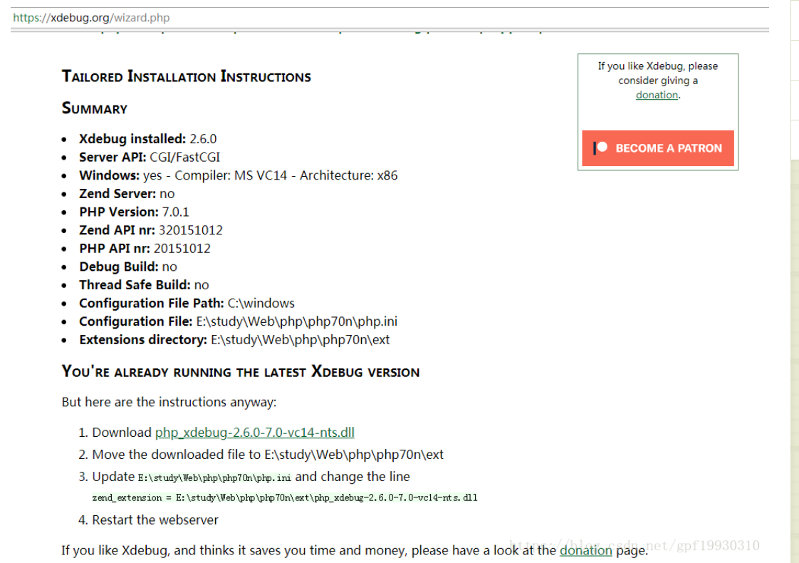 在方框中输入 phpinfo() 的页面内容,然后点击 “Analyse my phpinfo() output”,网站便会自动下载对应的xDebug.dll 文件,并告诉我们如何去配置php.ini 文件;