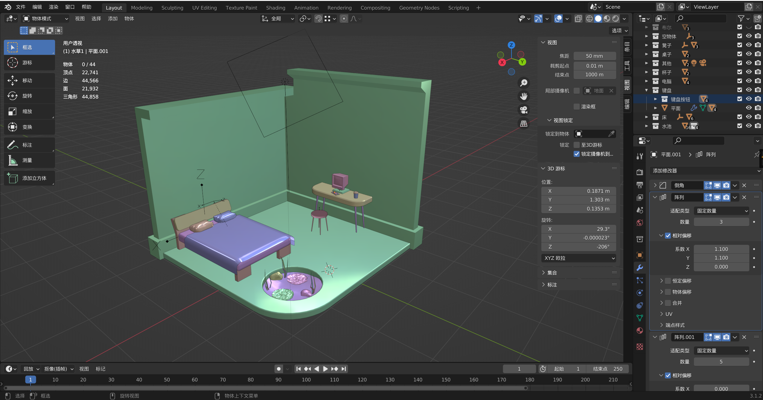 - 选择桌子(桌面),右键->设置原点->原点(质心体积),将原点设置到桌子中间,然后将镜像物体选择为桌面,桌腿就会出现在桌面的四个角(非常方便)