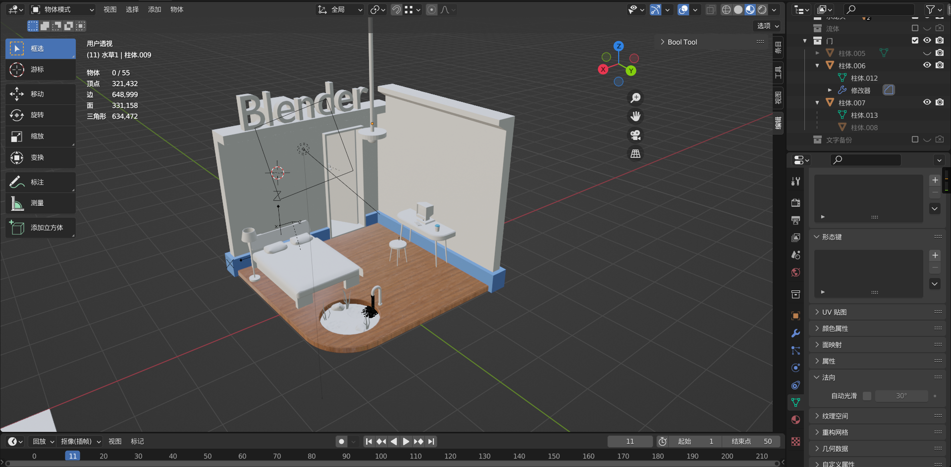 - 手动倒角会不光滑,但是需要光滑的话就在物体模式->选中模型->右键平滑着色,这样会导致模型很奇怪,因为我们只需要一个角光滑,然后右下菜单列表->物体数据属性(倒三角图标)->法向->自动光滑