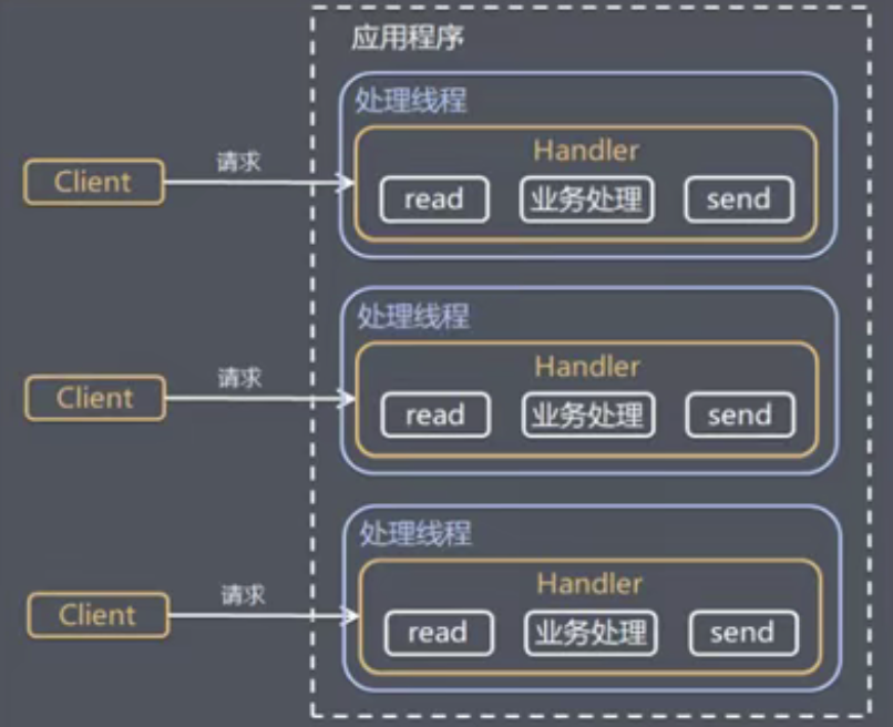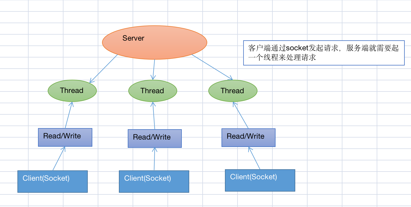 BIO是一个同步的阻塞IO模型,一个客户端连接就回启动一个线程,并且当服务端使用socket.accept()方法等待客户端连接和使用inputStream.read(bytes)读取客户端消息的时候都会进行阻塞,意思是,当服务端启动的时候就会启动一个线程来等待客户端的连接,如果没有客户端连接,则线程会阻塞在socket.accept()的位置;如果有客户端连接但是没有发送消息,则服务端对应的线程会阻塞在inputStream.read(bytes)的位置。