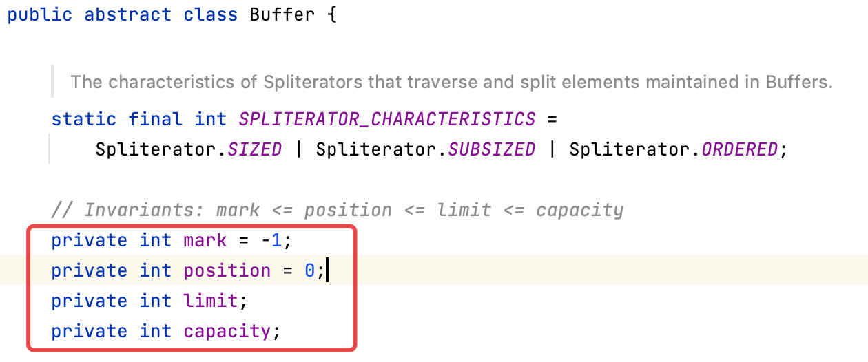 capacity:标识buffer的最大容量,在缓存区创建的时候设定并且不允许改变;limit:表示缓冲区的当前终点,不能对缓冲区超过极限的位置进行读写操作,并且该极限位置是可变化的,因为buffer是支持读写的;position:表示缓冲区中下一个被读或写的元素的索引,每次读写缓冲区的时候都会改变这个值,为下一次读写做准备;mark:标记
