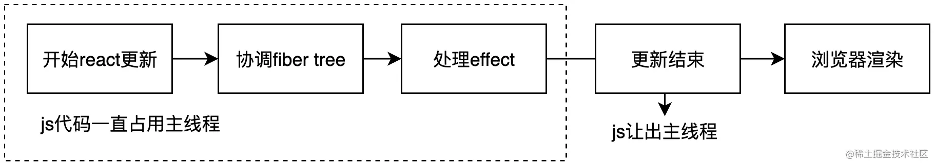 - 开始更新渲染后,协调过程是可中断的,不会长时间阻塞渲染引擎(进入浏览器渲染阶段依然会卡住);