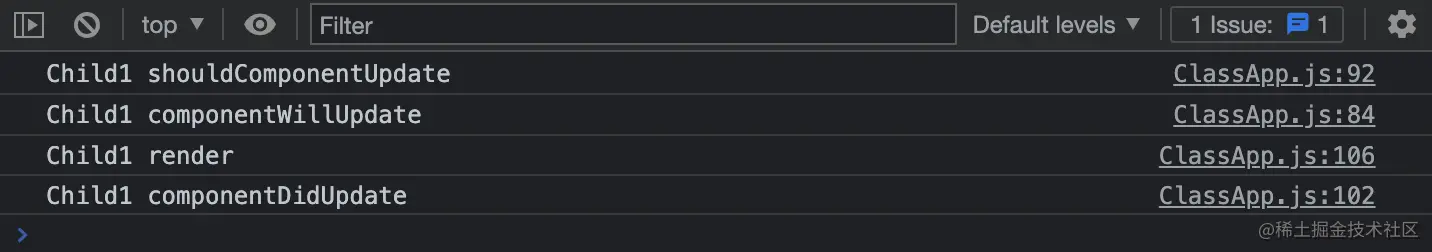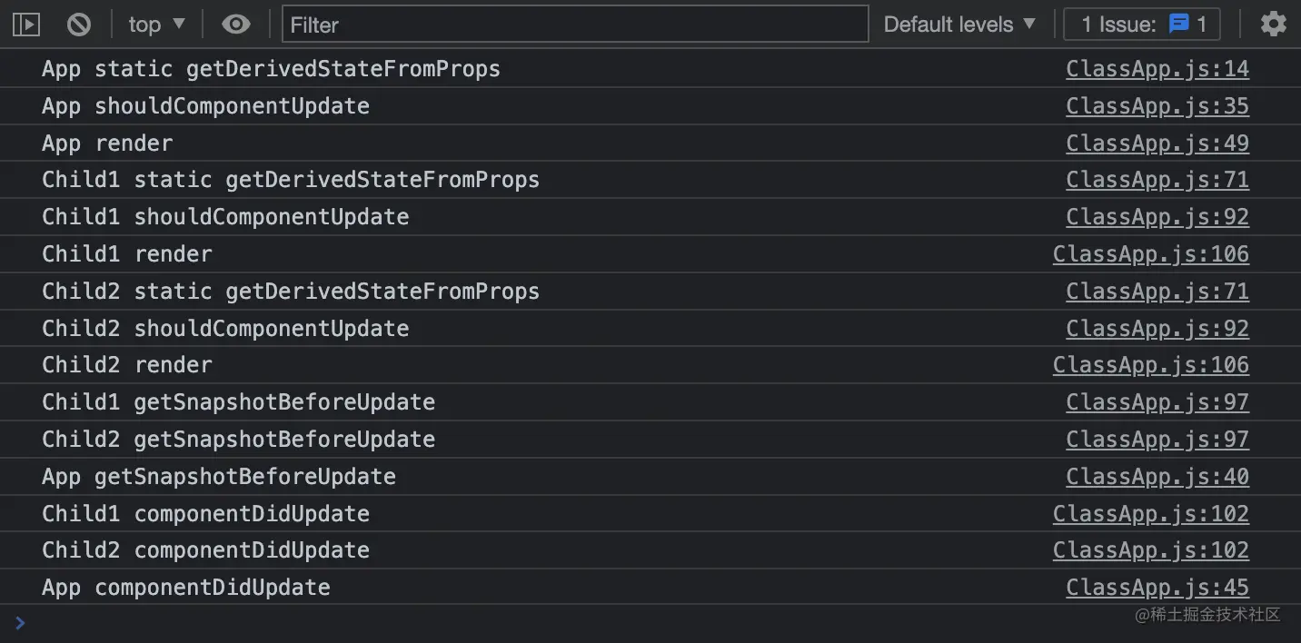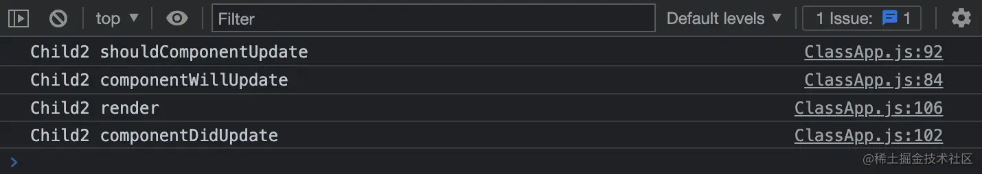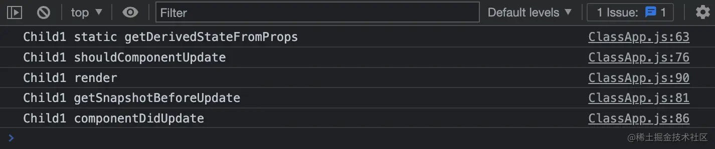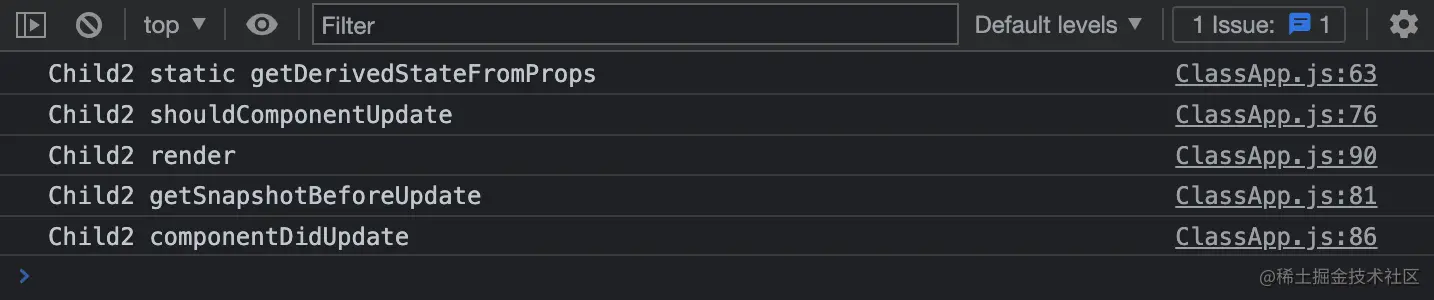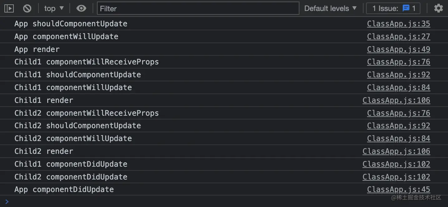 上面的结果中,并没有执行 componentWillReceiveProps 生命周期函数,因为使用 this.setState 触发组件更新时,并不会调用此生命周期钩子,只有 props 改变或者父组件更新导致子组件重新渲染时,才会执行这个生命周期钩子,看它的名字也知道它仅和 props 有关。