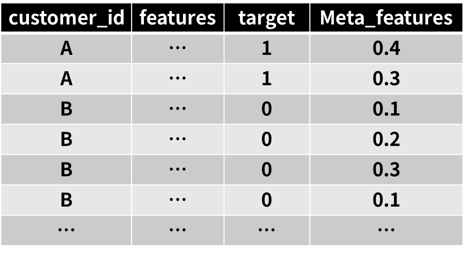 - 利用features做输入,target做输出,训练一个树模型,比如LGBM;这里要用k折交叉训练,做oof(out of fold)预测,得到每一条数据的预测值,作为meta features.