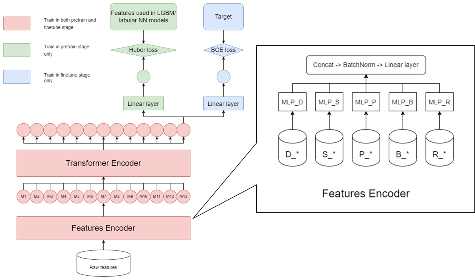 网络结构图来自kaggle的post.注意features是分类别输入的,利用上了提供的类别信息,同时concat也保证了不同类别特征的融合。