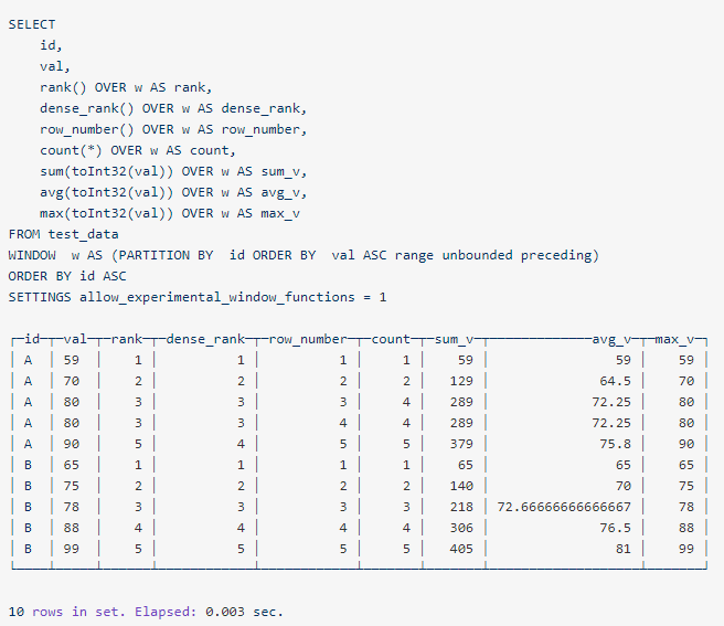 SELECT id, val, rank() OVER w AS rank, dense_rank() OVER w AS dense_rank, row_number() OVER w AS row_number, count(*) OVER w AS count, sum(toInt32(val)) OVER w AS sum_v, avg(toInt32(val)) OVER w AS avg_v, max(toInt32(val)) OVER w AS max_vFROM test_dataWINDOW w AS (PARTITION BY id ORDER BY val ASC range unbounded preceding)ORDER BY id ASCSETTINGS allow_experimental_window_functions = 1