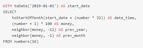 WITH toDate('2019-01-01') AS start_dateSELECT toStartOfMonth(start_date + (number * 32)) AS date_time, (number + 1) * 100 AS money, neighbor(money, -12) AS prev_year, neighbor(money, -1) AS prev_monthFROM numbers(16)