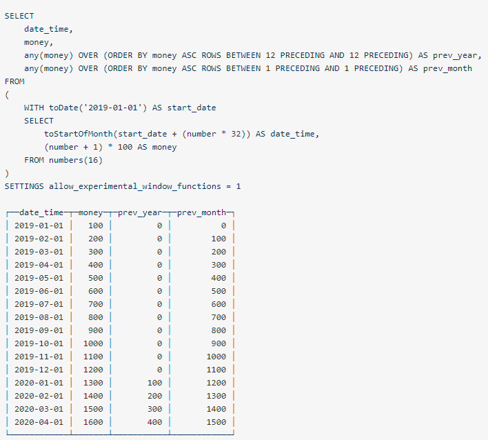 SELECT date_time, money, any(money) OVER (ORDER BY money ASC ROWS BETWEEN 12 PRECEDING AND 12 PRECEDING) AS prev_year, any(money) OVER (ORDER BY money ASC ROWS BETWEEN 1 PRECEDING AND 1 PRECEDING) AS prev_monthFROM ( WITH toDate('2019-01-01') AS start_date SELECT toStartOfMonth(start_date + (number * 32)) AS date_time, (number + 1) * 100 AS money FROM numbers(16))SETTINGS allow_experimental_window_functions = 1