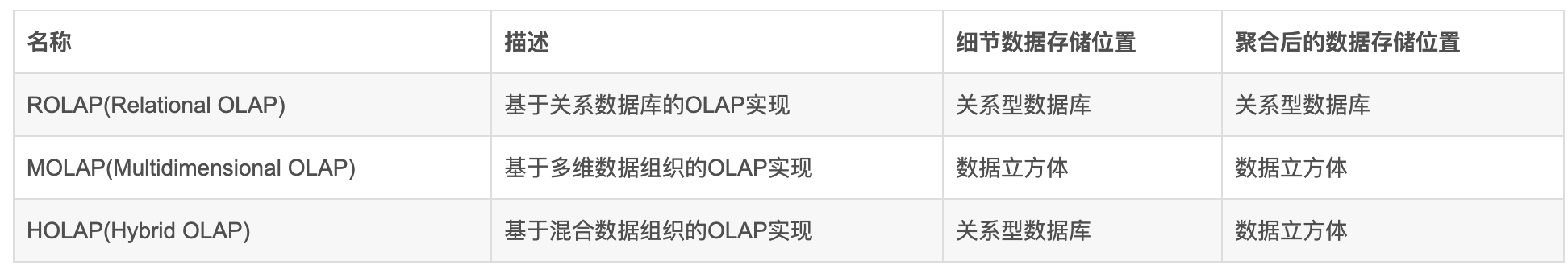 OLAP有多种实现方法,根据存储数据的方式不同可以分为ROLAP、MOLAP、HOLAP。