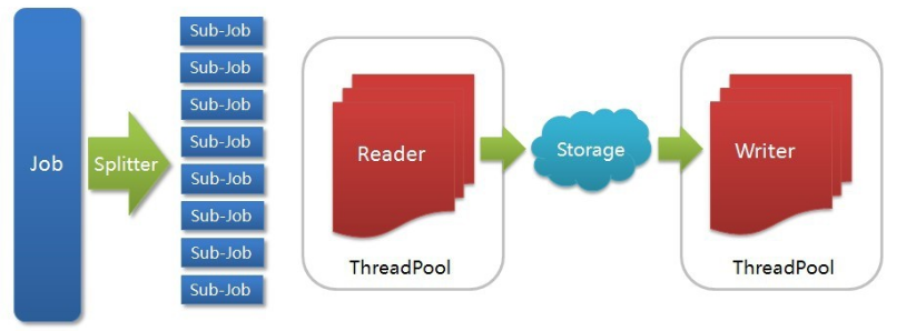 Job:一道数据同步作业Splitter:作业切分模块,将一个大任务与分解成多个可以并发的小任务.Sub-job:数据同步作业切分后的小任务Reader(Loader):数据读入模块,负责运行切分后的小任务,将数据从源头装载入DataXStorage:Reader和Writer通过Storage交换数据Writer(Dumper):数据写出模块,负责将数据从DataX导入至目的数据地 DataX框架内部通过双缓冲队列、线程池封装等技术,集中处理了高速数据交换遇到的问题,提供简单的接口与插件交互,插件分为Reader和Writer两类,基于框架提供的插件接口,可以十分便捷的开发出需要的插件。