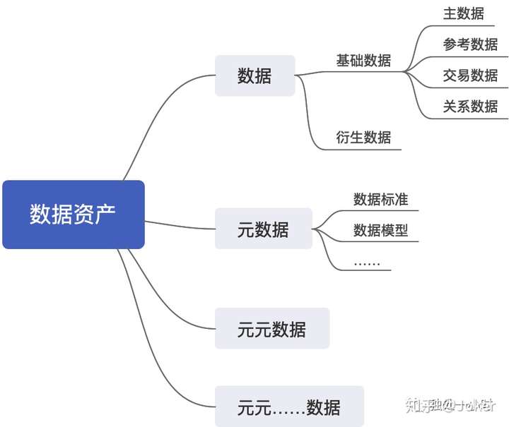 常见的分类维度,可以把数据资产分为:数据和描述数据的数据,也就是元数据,再高阶的分类还可以分为描述元数据的数据,也就是元元数据。
