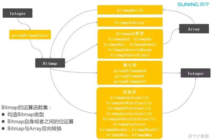 上图的中间部分是 Bitmap 的计算函数集,有位运算函数、聚合运算函数、求值类运算函数,比较丰富。