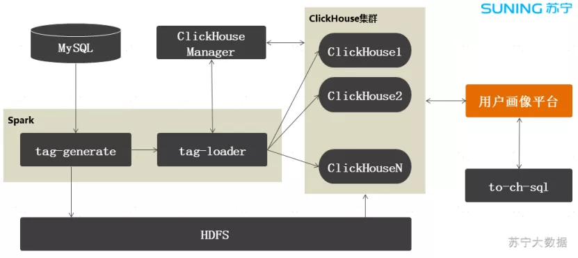 Spark 任务负责标签数据的生成和导入,当某个业务方的任务跑完后,会立刻调用 tag-generate 生成标签数据文件,存放到 HDFS,然后在 ClickHouse 上执行从 HDFS 导入到 ClickHouse 的 SQL 语句,这样就完成了标签的生产工作。