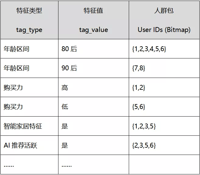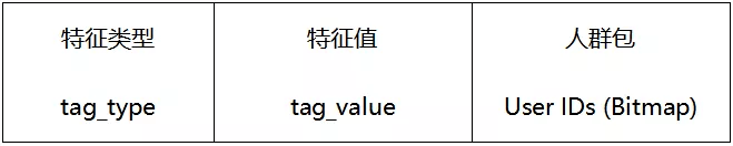 将一个特征值下的 userid 集合做为 Bitmap 对象存储到一条记录中,一条记录的内容如下: