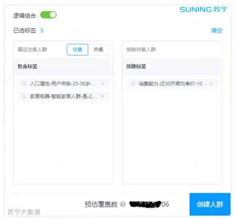 上图的标签选择的含义为:“用户年龄范围为 25-36 岁”并且为“智能家居特征”的人群,排除最近 30 天消费小于 10 元的人群。