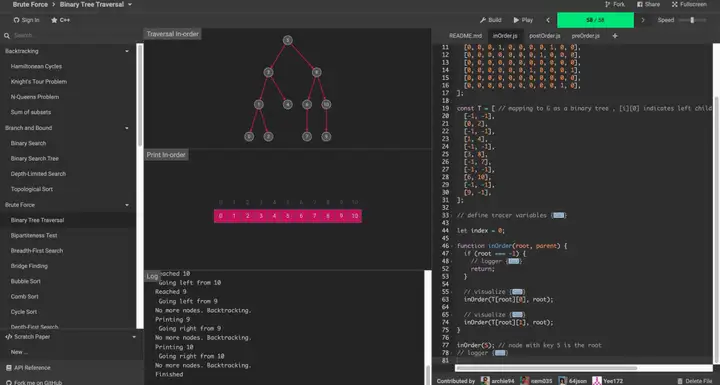 Algorithm Visualizer 是强大的算法可视化工具,它不一样的地方在于,它支持 C++、Java、JavaScript 编程语言,是一个不仅能看动图,也能自己编程的网站。地址:
