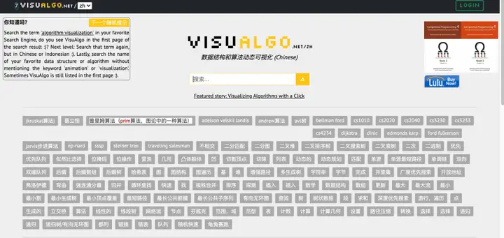 VisuAlgo 网站主页显示的数据结构不多,但是并不意味它只支持显示出来的,如果你想学习的数据结构并没有在主页中,可以通过搜索框来查找: