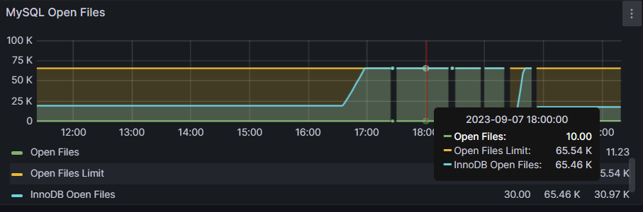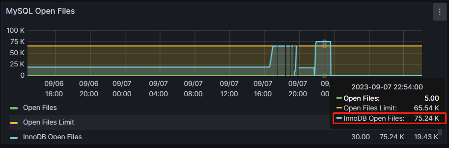 通过监控可以看到,Innodb OPen Files 已经超过了原来的65535的限制,达到了75240,error 日志中也不在报错