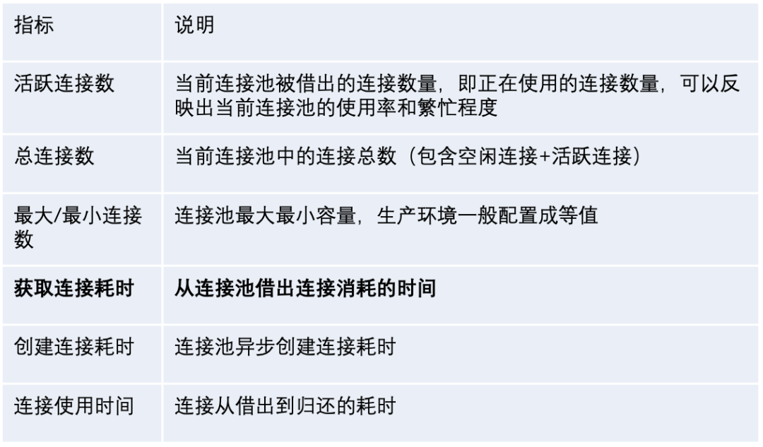 排查问题的前提是发现问题,所以首先需要有连接池的详细监控,下面我们以 HikariCP 为例,简单介绍几个常用的指标的含义。