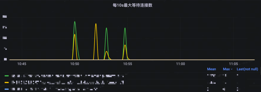 获取连接耗时较高最直接的原因就是存在等待连接数,这种情况直接观测等待连接数的大盘即可