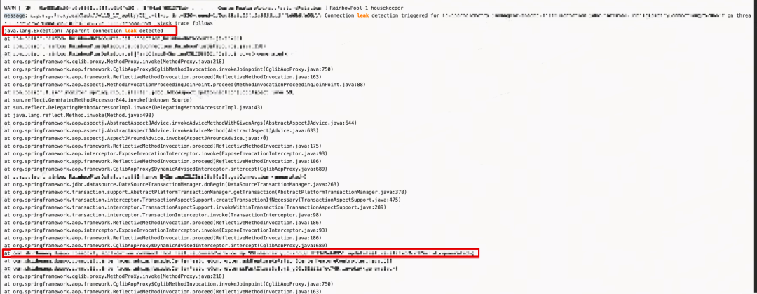 长事务是很容易忽略的一种 case,可以通过观测连接使用时间指标和 SQL 耗时来分析,如果连接使用平均耗时远大于 SQL 平均耗时,那么说明有长事务。还可以根据 HikariCP 自带的连接泄露检测来分析,当连接被借出后长时间未归还(超过配置的阈值 leak-detection-threshold=30000)会打印借出时的堆栈,可以帮助我们快速定位。
