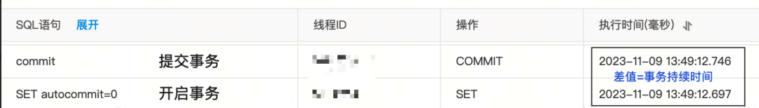 还可以通过 RDS 的 SQL 洞察来分析是否有长事务,如果使用 Spring+JDBC 管理事务的情况下,开启事务的命令是 SET autocommit=0,提交事务是 commit,这里根据数据库线程 ID 来逐个分析,提交事务的时间-开启事务的时间=事务持续时间。