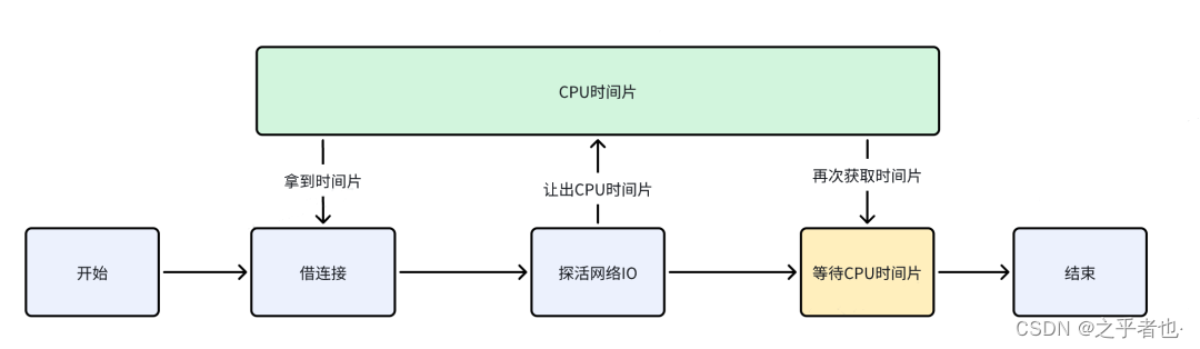 由于 HikariCP、Druid 在从连接池借出连接时,会有一个同步探活的操作,比如直接 MySQL 的 PING 命令或执行 select 'X' 等,因为有网络 IO,所以这里会让当前线程进入阻塞状态让出 CPU 时间片。