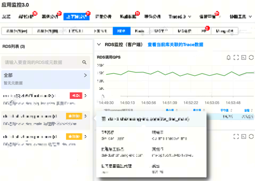 当数据库或者数据库中间件出现异常时,对于上游应用的表现大多数就是 SQL RT 增高、TCP 重传。如果怀疑是数据库或者数据库中间件出现异常,可以先确定自己的应用连的是哪个库,这里可以通过应用监控(上下游 -RDS)直观的看到应用连接的具体的库信息,然后再观测对应 RDS 和数据库中间件的监控进一步分析。