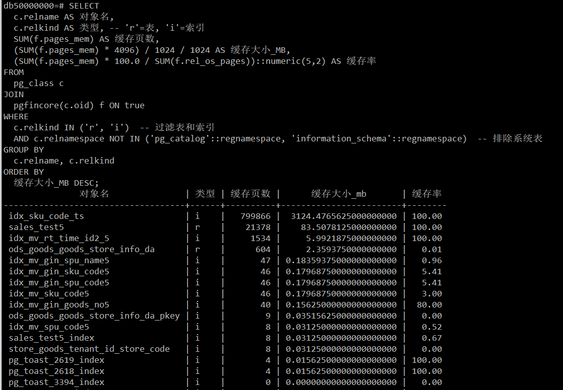 (SUM(f.pages_mem) * 100.0 / SUM(f.rel_os_pages))::numeric(5,2) AS 缓存率