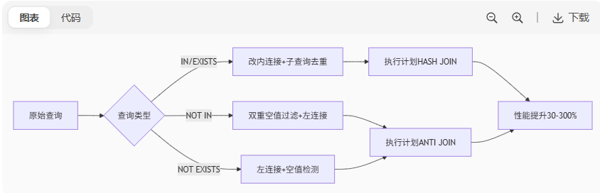 EXISTS | 内连接 + 子查询去重 | 自动处理空值 | FILTER → HASH JOIN | 提升 3x |