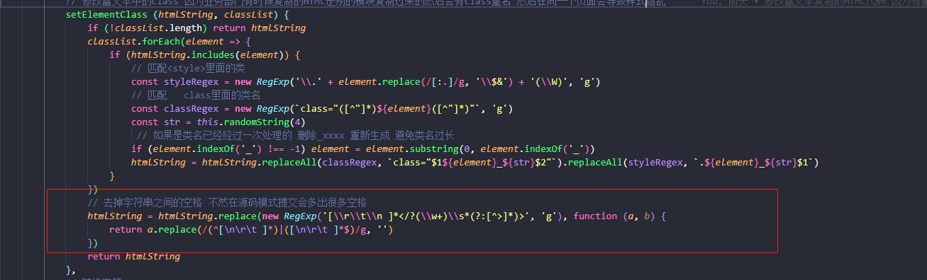 然后 问题2 其实也简单 setElementClass返回值之前 先用正则处理一下空格再返回 主要是去UEditor源码找这段正则找的我头疼