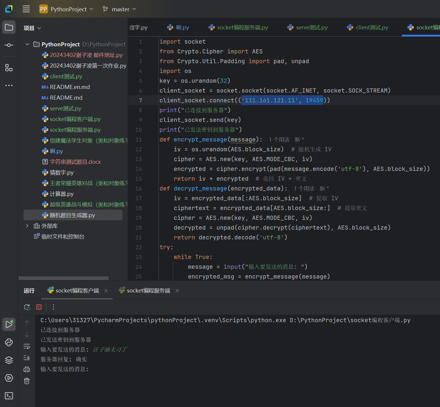 (1)创建服务端和客户端,选择一个通信端口,用Python语言编程实现通信演示程序;