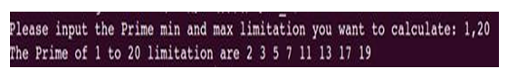printf("Please input the Prime min and max limitation you want tocalculate: ");