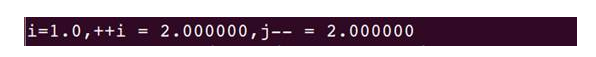 printf("i=1.0,++i= %f,j-- = %f\n",++i,j--);